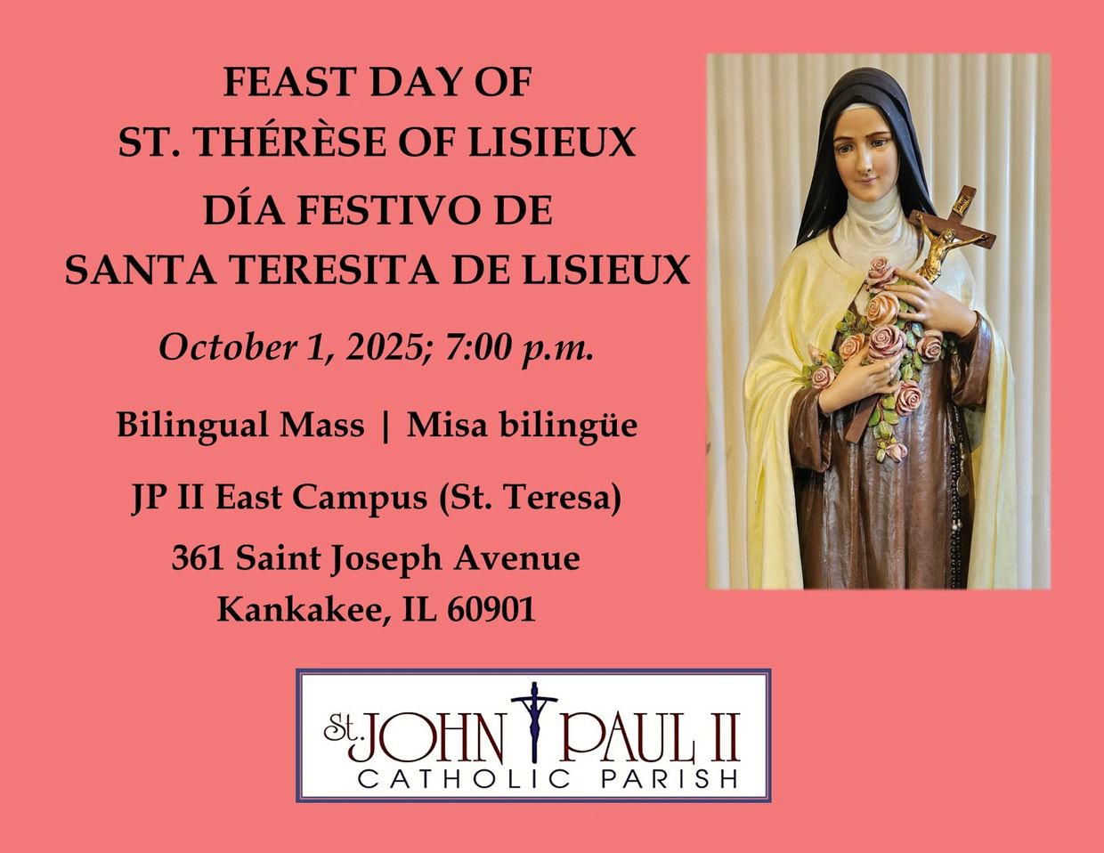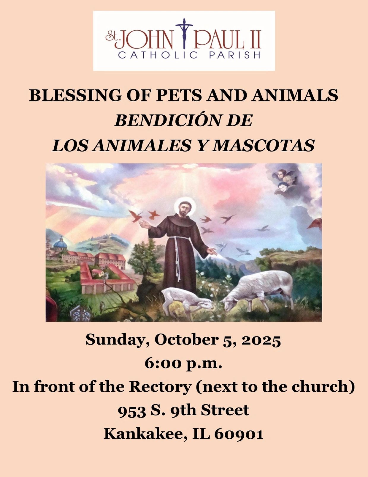 Welcome to the Parish of Saint John Paul II in Kankakee, Illinois! Established on July 1, 2017, and built upon the legacy of the parishes of St. Rose, St. Teresa, and St. Martin of Tours, our mission, by the grace of God, is to bring Christ to everyone and everyone to Christ. From our celebration of the sacraments, Masses, liturgies, and devotions to our faith formation program, food pantry, free medical clinic, clothing closet, and other ministries and apostolates, we endeavor to respond to our Lord's call to build up His Kingdom and form a community that joyfully proclaims the Good News. Jesus Christ is at the heart of our parish, Surrounded by the Blessed Mother and the communion of saints, and inspired by the holy example of our patron, Saint John Paul II, we strive to be a holy and joyful family in faith.